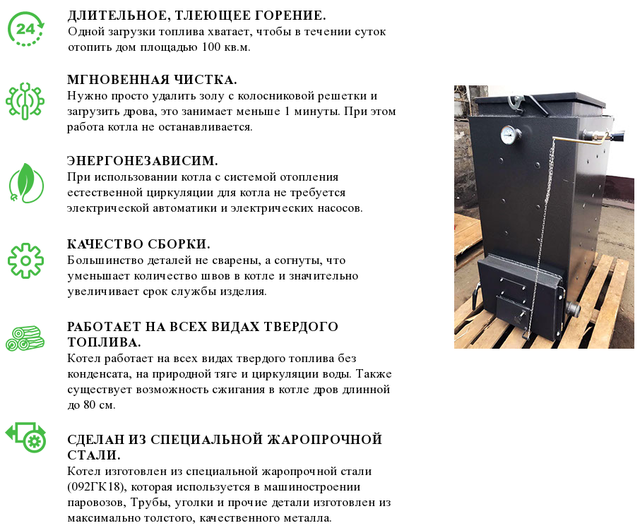 Агрегат може ефективно обігрівати приміщення, площа яких становить не більш ніж 250 м2. Котел оптимальний для опалення житлових будинків, цехів, офісів і виробничих приміщень.